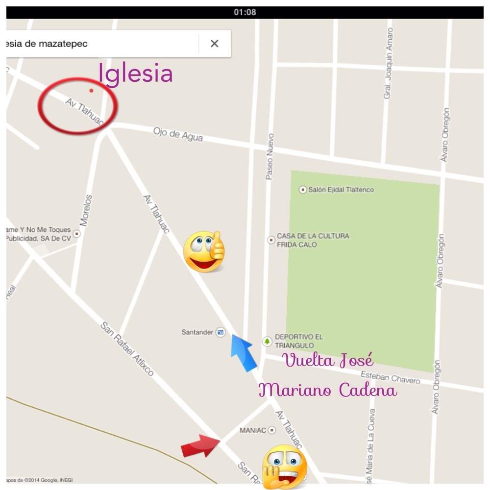 (Una vez que pasan El Quijote, se siguen sobre la Av. Tlahuac, también llamada San Rafael Atlixco (mapa) y pasando un arco de piedra negra darán vuelta a la izquierda en la calle José Mariano Cadena (justo en la esquina hay una indicación: "casa de la cultura Frida Kahlo") tomarán Av. Tlahuac de regreso y del lado derecho encontraran la iglesia que esta juntó a una Alianza (vinos).